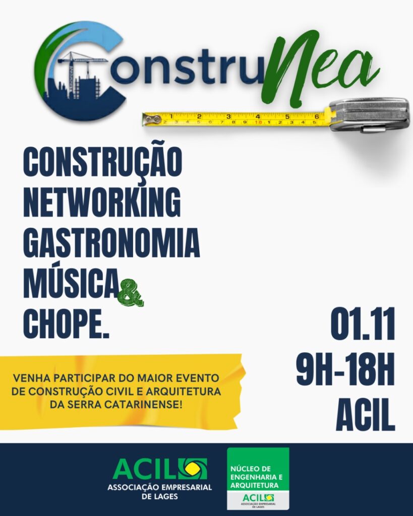 No dia 1º de novembro, Lages será palco do maior encontro regional de construção civil e arquitetura: o Construnea 2025. Realizado na sede da ACIL, das 9h às 18h, o evento é promovido pelo Núcleo de Engenharia e Arquitetura (NEA) e promete reunir mais de 200 profissionais, empresários e estudantes.