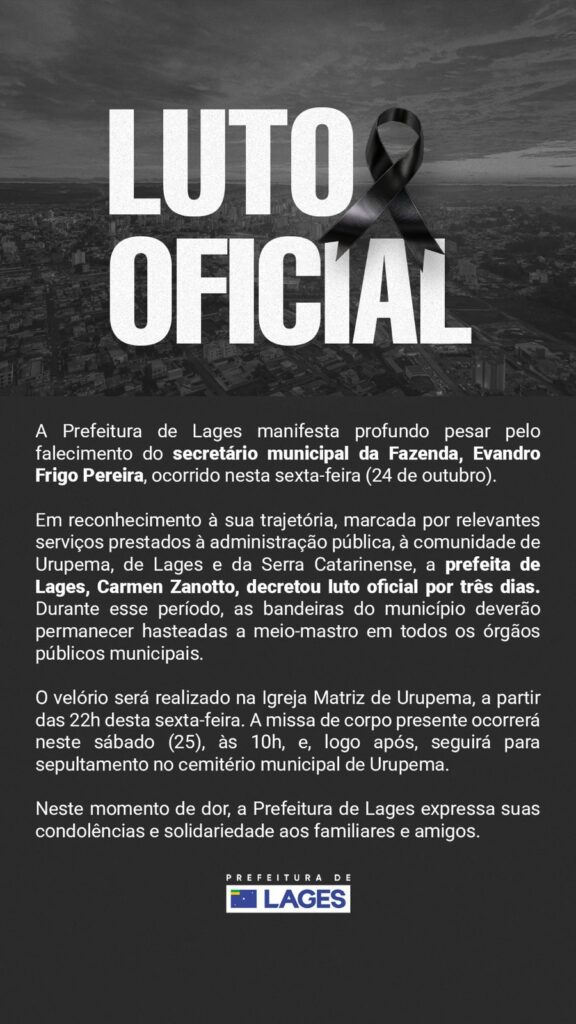 É com muita tristeza que nos chega a informação do falecimento do então Secretário da Fazenda, do Município de Lages, Evandro Frigo Pereira (foto).