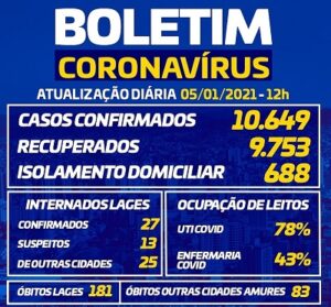 A Saúde de Lages divulgou hoje o Boletim Epidemiológico Semanal da Secretaria da Saúde de Lages, e também, ao meio dia, o da atualização diária. O boletim aponta 10 mil 649 casos confirmados até agora, com 9 mil 753 recuperados. Outros 688 estão em isolamento domiciliar.