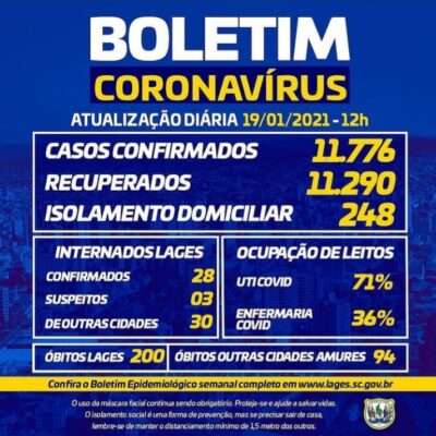 Enquanto isso, o Boletim Coronavírus de Lages divulgado ao meio dia trás os números até então computados. Como se vê, o Município chegou aos 200 mortos em detrimento de complicações com o vírus.