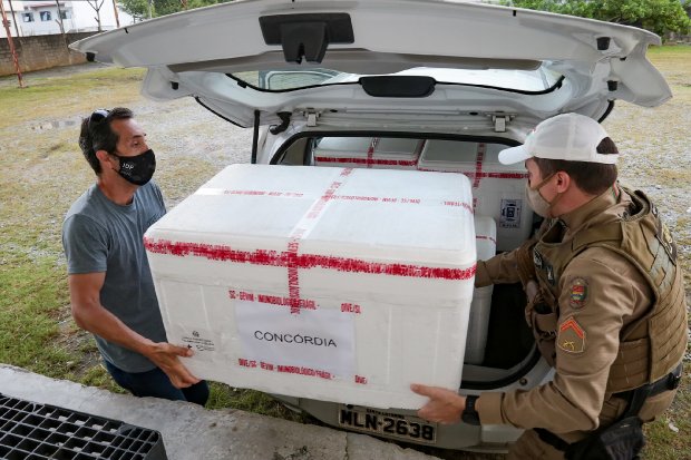 Os imunizantes começaram a sair da Grande Florianópolis por volta das 7h30, desta quinta-feira, 25, com destino a Chapecó, São Miguel do Oeste, Xanxerê, Concórdia, Lages, Rio do Sul, Joaçaba e Videira.