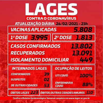 A Saúde de Lages mudou a cor padrão azul do Boletim, agora em vermelho, exatamente para chamar mais atenção. Ressalta o número de vacinas aplicadas, e também mantém os números dos casos confirmados, altos por sinal, dos recuperados e dos que estão em isolamento domiciliar.
