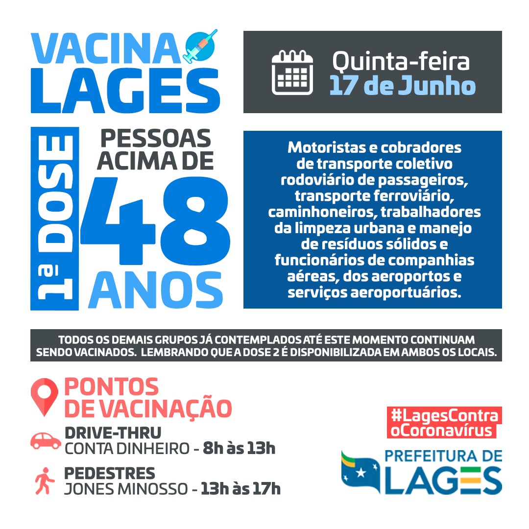 Nesta quinta-feira (17), a vacinação em Lages teve uma nova mudança no horário da vacinação. A vacinação para pessoas com 48 anos ou mais começou às 8h e prossegue somente até às 13h no Drive Thru no parque Conta Dinheiro e das 13h às 17h no Jones Minosso para pedestres. Lembrando que os demais grupos já elencados, a vacinação continua.
