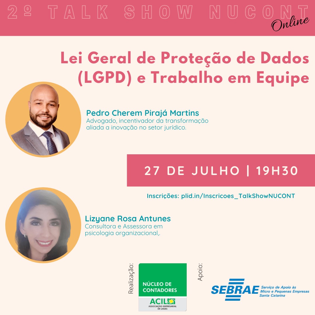 O debate terá como tema a Lei Geral de Proteção de Dados (LGPD) e o Trabalho em Equipe, com a presença de Pedro Cherem Pirajá Martins, advogado, incentivador da transformação aliada à inovação no setor jurídico. É também assessor Jurídico do SEBRAE/SC, especialista em Direito Digital, experiência direta com demandas jurídicas corporativas, além de atuar com consultoria em proteção de dados pessoais, conformidade digital e compliance. Presidente da Comissão de Inovação, da OAB/SC.