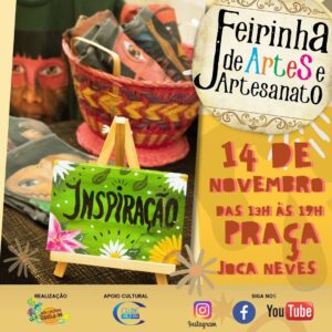 A Feirinha de Artes e Artesanatos está programada para este domingo (14 de novembro), das 13h às 19h, na Praça Joca Neves, com 64 bancas de artesanatos, brechós e suculentas.