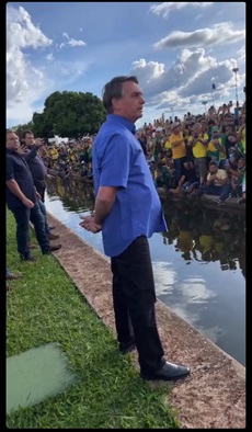 O presidente Jair Bolsonaro enfrentou a multidão próximo ao Palácio da Alvorada, e passou uma mensagem otimista e cabível de interpretações. Foi a primeira aparição pública junto aos apoiadores.
