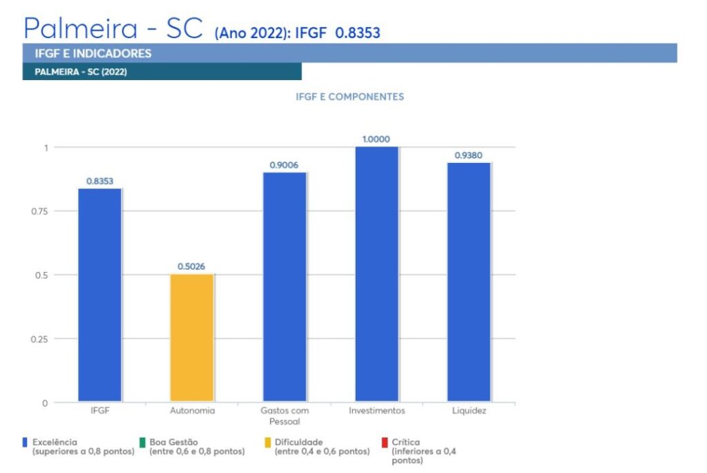 O município conquistou uma nota geral de 0,8353, com índices de excelência em três dos quatro indicadores individuais. Notavelmente, a cidade alcançou a pontuação máxima de 1 no quesito “Investimentos”, demonstrando seu compromisso com o desenvolvimento local.