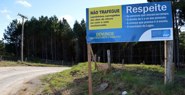 Enquanto isso não se efetiva, está iniciando uma campanha para diminuir o tráfego de caminhões nas estradas vicinais de Lages, com a fixação de placas de advertência.