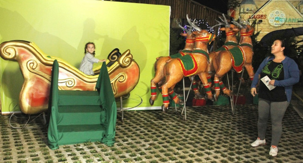 Sentadas no trenó do Papai Noel, as pessoas têm a imagem projetada no edifício Centenário.