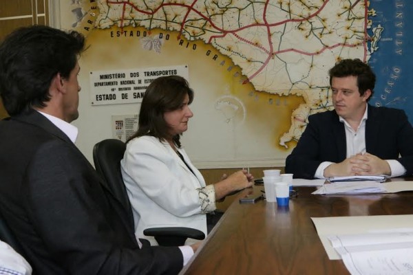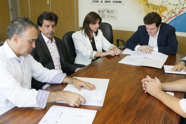Deputada Carmen Zanotto (PPS), prefeito interino Toni Duarte e secretário Jorge Raineski (Seplan) encontraram com os engenheiros do DNIT José VissilAr Pretto e Eng. Enio Spikler, em Florianópolis, para a entrega do projeto definitivo das passarelas a serem construídas na travessia urbana da BR-282 (além de outros pontos da rodovia).