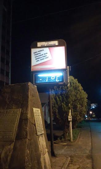 Em São Joaquim, por volta das 22 horas dessa segunda-feira (15), o termômetro da praça central já marcava – 1 grau.