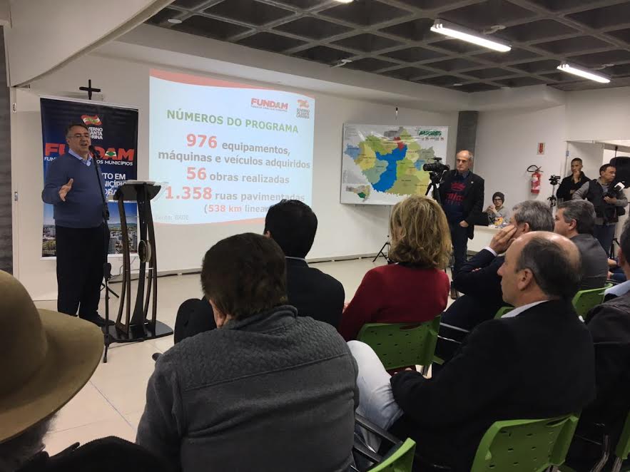 O governador Raimundo Colombo esteve na tarde desta sexta-feira (23), no Orion Parque Tecnológico da Serra Catarinense, para a apresentação do Fundo de Apoio aos Municípios (Fundam)que entra na sua segunda edição. O ato reuniu todos os prefeitos da Associação dos Municípios da Região Serrana (Amures).