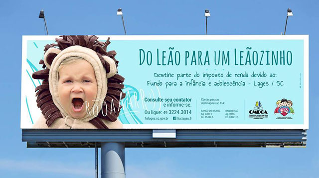 No início de dezembro deste ano, nove outdoors da Campanha “Do Leão para um Leãozinho” serão espalhados pela cidade para sensibilizar a sociedade, contadores, empresários e pessoas físicas a destinar valores do Imposto de Renda (I.R.) ao FIA, fazendo com que os recursos retornem ao município em forma de projetos sociais.