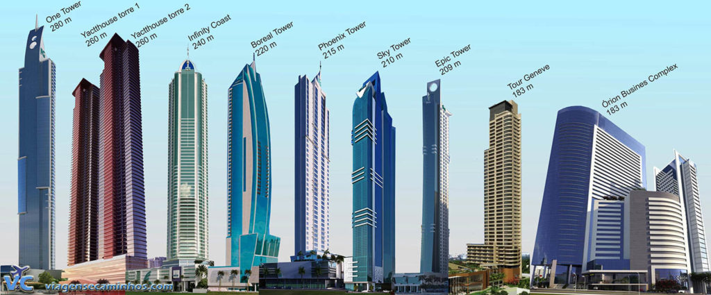 Além dos prédios gigantes, já concluídos, como o Millennium Palace (177,3 m) e as torres gêmeas da Villa Serena (160 m), há outros 8 edifícios em construção, em Camboriú que irão passar dos 200 metros. (Fonte: VC Viagens e Caminhos)