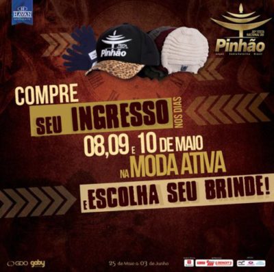 Quem comprar ingresso antecipado para qualquer espaço entre os dias 8 e 10 de maio, na loja Moda Ativa, irá levar como brinde uma peça personalizada da Festa do Pinhão. São quatro opções de peças: gorro, cachecol, luvas e boné.