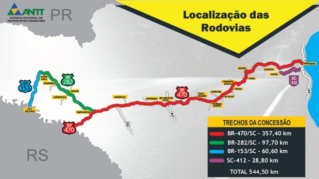 A proposta de concessão engloba um trecho de 515 quilômetros em Santa Catarina, entre Navegantes e a divisa com o Rio Grande do Sul, envolvendo três rodovias (BR-153, BR-282 e BR-470).