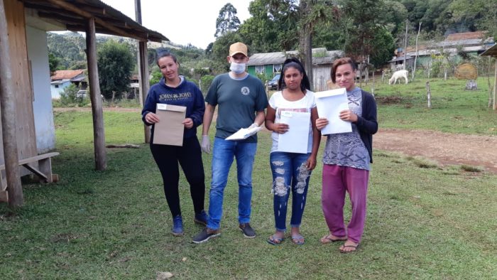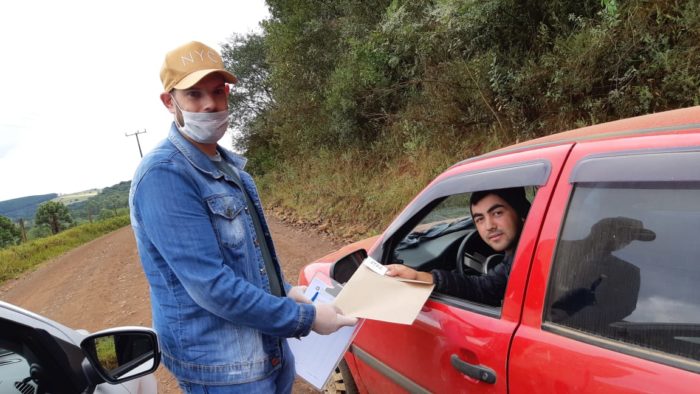 Depois, um professor voluntário, de Educação Física, o Marcelo Raitz, com máscara e álcool em gel nas mãos, vai de casa em casa nas propriedades interioranas para fazer a entrega do material.
