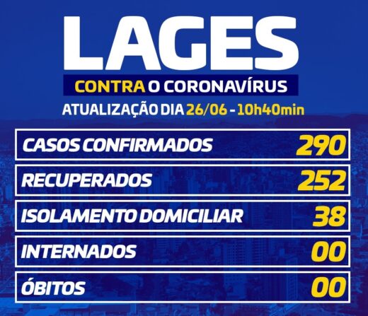 Mesmo com muita gente descuidada em Lages, os números de casos de coronavírus seguem relativamente sob controle. Pois, de acordo com o Boletim Epidemiológico divulgado às 10h40 da manhã desta sexta-feira (26), são 290 os casos confirmados. No entanto, o contraste vem do número de recuperados: 252. São, portanto, apenas 38 pessoas que seguem em recuperação no próprio domicílio. O único caso de internação deixou a UTI. E bom de tudo é de que Lages segue sem óbitos, o que a gente torce para não acontecer.