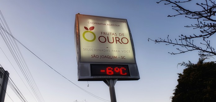 Segundo conta, os termômetros assinalaram a marca de -5.7ºC. No centro da cidade de São Joaquim, onde o termômetro encantou os turistas mostrando a temperatura de -6ºC.