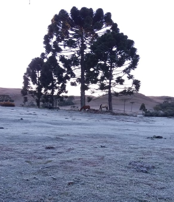Mais uma vez os campos de cima da Serra amanheceram cobertos pela forte geada. O registro rotineiro em tempos de inverno na Região.