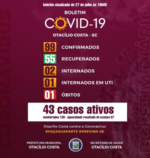Quadro deste segunda (27), em Otacílio Costa, do Boletim Epidemiológico