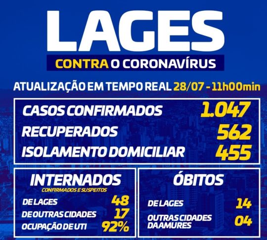 Um índice extremamente negativo e que constata a superação dos mil contaminados em Lages. O Boletim Epidemiológico divulgado às 11 horas desta terça-feira (28), mostra o número de 1047 casos confirmados. Obviamente, também devem ser levados em conta os já curados que chegam a 562, e outros 455 menos graves, em isolamento familiar. Quanto às internações, creio que é fator mais preocupante. São 48 de Lages e 14 da Região, o que põe em risco a ocupação das UTIs, agora na margem de 92%. Óbitos, são 18 na Região, sendo 14 somente de Lages.