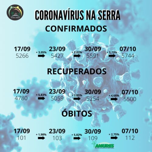 Nos 18 municípios a estabilidade da pandemia é analisada pelo Setor de Comunicação da Amures, que finalizou o relatório às 16h30 desta quarta-feira (07). Nos demais números, os casos recuperados sobem 2,73% em comparação aos 3,02% registrados na última semana. Os óbitos crescem apenas 2,75%, reduzindo pela metade os 5,82% elevados do relatório anterior.