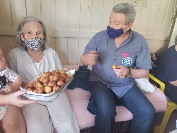 Além disso, os candidatos conversaram com as duas comunidades e mais uma vez foram muito bem recebidos. A Dona Bernardina de Oliveira Linhares de 93 anos, que fez questão de receber em sua casa, Ceron e Juliano para tomar um café com bolinho frito, comentou que apesar de sua idade e não ter mais a obrigação de votar, seu voto sempre será do Ceron. (13 de out. de 2020 – 08:16).