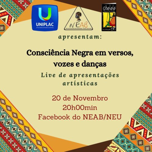 A live Consciência Negra em versos, vozes e danças acontece neste dia 20 de novembro, sexta-feira, às 20h e será transmitida pela página do Facebook do NEAB/NEU.