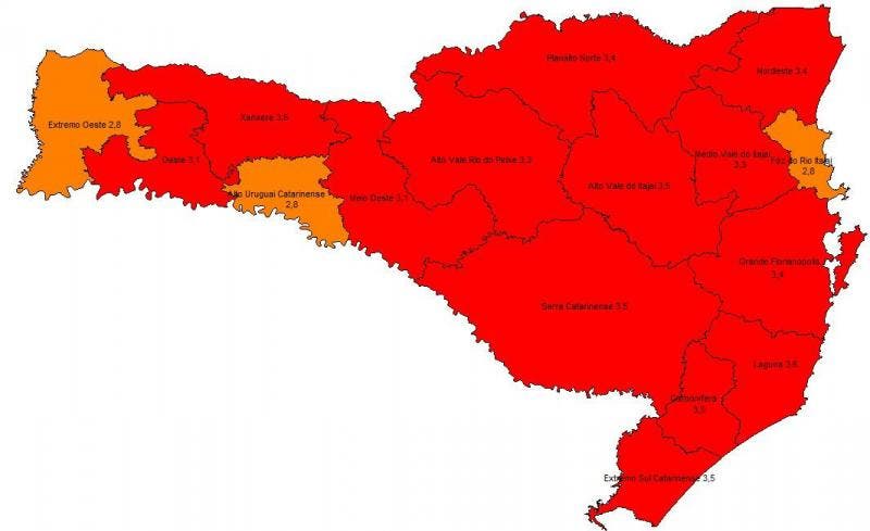 Entre essas 13 regiões destacadas no novo mapa divulgado pelo Governo do Estado está a Serra Catarinense, bem sinalizada na cor vermelha. As demais regiões são Extremo Sul, Carbonífera, Laguna, Grande Florianópolis, Alto Vale do Itajaí, Médio Vale, Nordeste, Planalto Norte, Alto Vale do Rio do Peixe, Meio Oeste, Oeste e Xanxerê. Apenas três estão na cor laranja (grave): Foz do Rio Itajaí, Alto Uruguai e Extremo Oeste. O vermelho é o pior nível na classificação adotada.