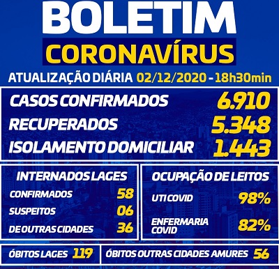 As autoridades estaduais e municipais estão implementando medidas restritivas, com o objetivo de tentar conter o avanço do coronavírus, mas, importante que todos façam também a parte que lhes cabe, seguindo as recomendações. Observem atentamente os números do Boletim Epidemiológico de Lages e Região divulgado nesta quarta-feira (2). Atente-se para o número de óbitos, mais sete de um dia para o outro; os casos confirmados e a ocupação da UTI Covid, de 98%.