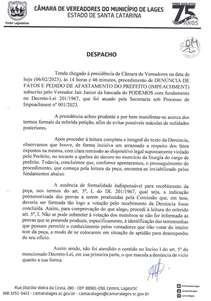 Diante da proposição de que fosse votado ainda na segunda-feira (6), pelo vereador Jair Junior (Podemos), o pedido de impeachment contra o prefeito Antonio Ceron (PSD), devido à prisão e o possível envolvimento dele , em desdobramentos da Operação Mensageiro, o presidente da Câmara de Vereadores de Lages, Aldori Antonio Freitas emitiu o seguinte despacho: