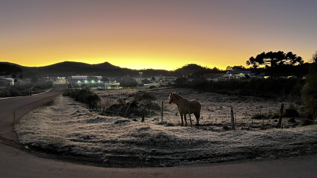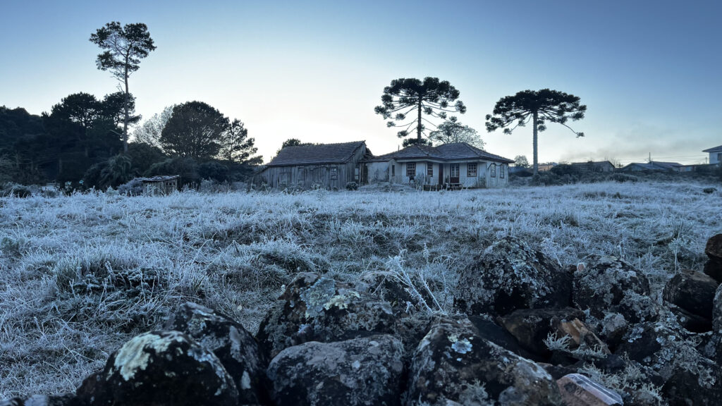 O amigo e jornalista Paulo Scarduelli compartilha com o Blog o registro da forte geada, no amanhecer desta terça-feira (13), na Villa Francioni, em São Joaquim, e com temperatura de -3°C. A foto é do enólogo Edson Andrade.