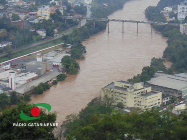 No Meio Oeste, em Joaçaba, a situação está bastante crítica. O nível do Rio do Peixe passa dos 10 metros e muitos locais estão sob as águas.