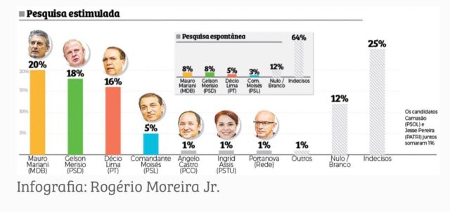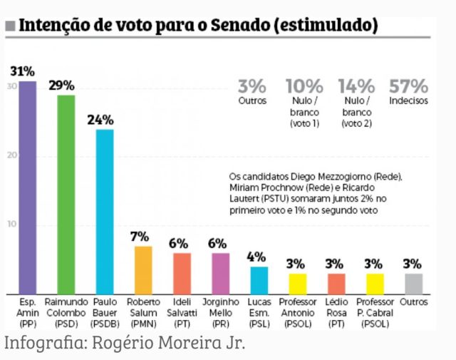 Os números apontam Mauro Mariani (MDB) com 21%, em segundo Gelson Merisio (PSD) com 18, seguido de Décio Lima (PT), com17%. Portanto, está declarado o empate técnico entre os três primeiros. O quarto colocado é Comandante Moisés (PSL), com 4%.