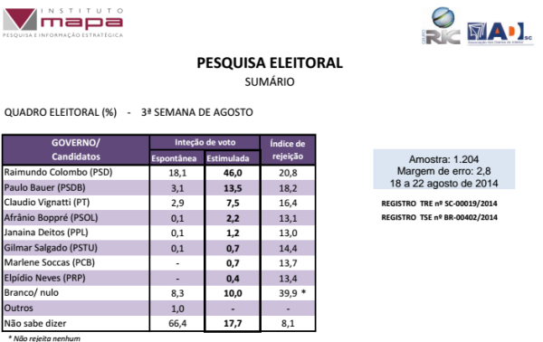 Com esses novos índices o indicativo é de que Raimundo Colombo ampliou ainda mais a margem para os demais candidatos em 6,5%.