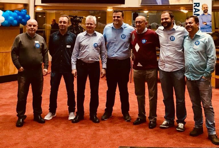 Na foto, a delegação dos Progressistas de Lages. Juliano Polese e Luiz Marin, aparecem abraçados. Marin é o de blusa vermelha.