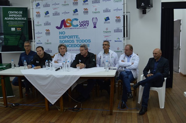 Momentos antes da abertura oficial da 57ª edição dos Jogos Abertos de Santa Catarina, os responsáveis pela realização do evento, entre eles o prefeito Antonio Ceron e o secretário de Turismo, Esporte e Cultura, Leonel Pavan, houve uma rápida conversa com a imprensa.