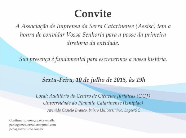 A Associação de Imprensa da Serra Catarinense (Assisc) empossa a diretoria, no próximo dia 10 de julho.