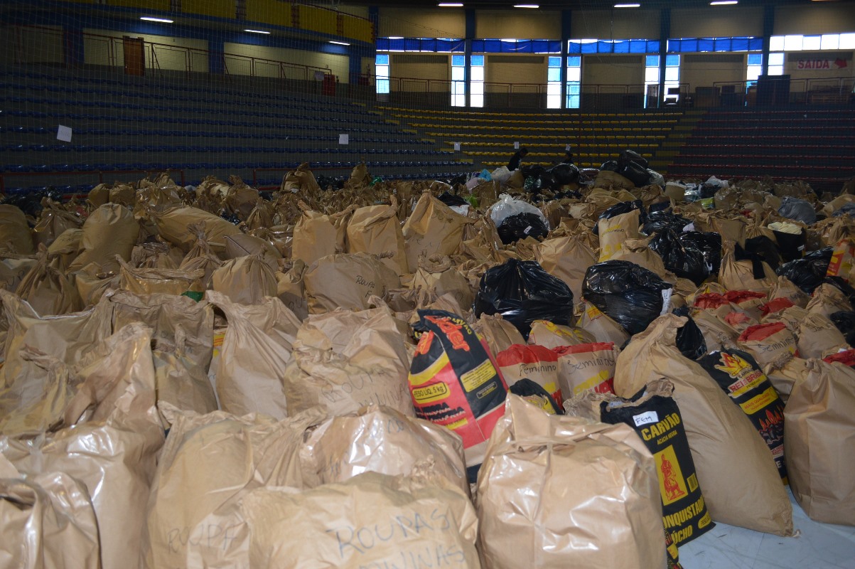 Milhares de roupas, calçados, cobertores, alimentos, colchões e materiais de limpeza foram levados para o ginásio Jones Minosso, onde com a ajuda de voluntários, foram organizados e separados para a distribuição.