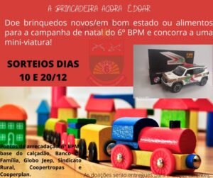 Eis uma bela iniciativa a do 6º Batalhão de Polícia Militar, em lançar uma campanha de Natal visando arrecadar brinquedos e alimentos às crianças carentes dos bairros e da área rural de Lages.