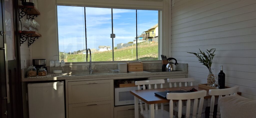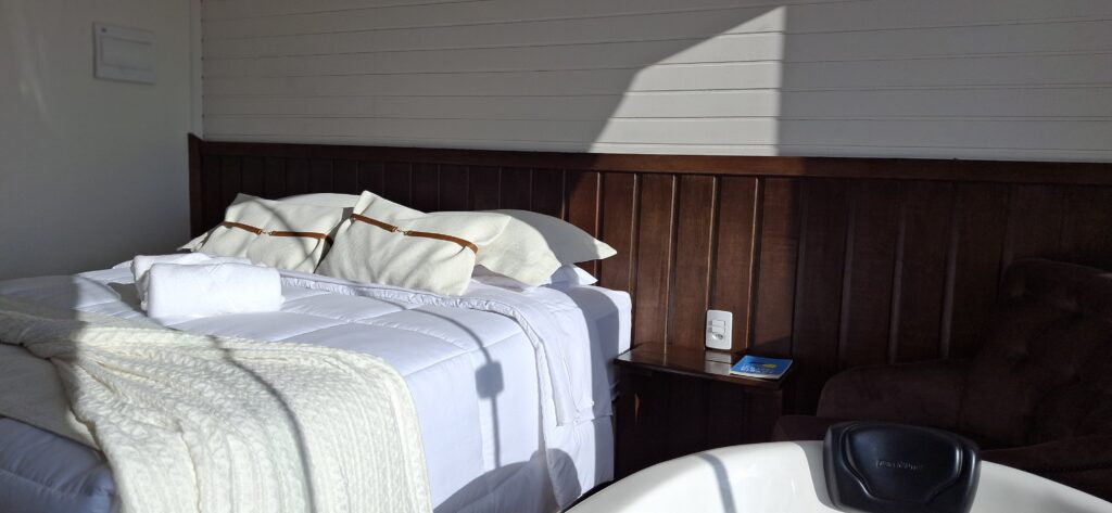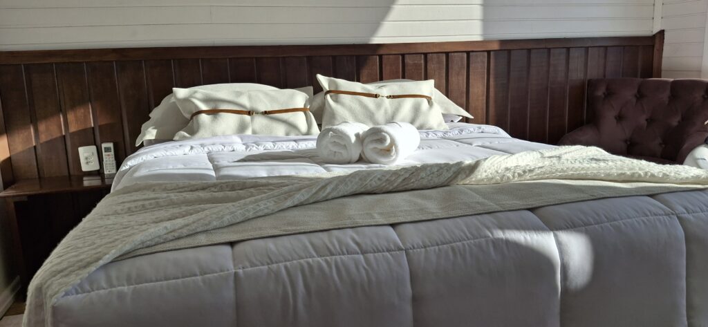 Cada cabana foi planejada para proporcionar bem-estar real, sem exageros e sem promessas vazias.; cama de alto padrão hoteleiro, enxoval selecionado e iluminação cênica em LED; cozinha equipada e ambientes integrados para quem deseja estender a estadia; deck externo pensado par ver o nascer ou o pôr do sol com taça de vinho na mão.
