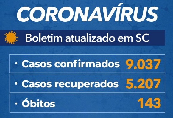 Santa Catarina já registrou 9.037 pacientes com teste positivo para Covid-19, dos quais 5.207 já estão recuperados e 3.687 permanecem em acompanhamento. O número foi divulgado neste domingo, 31.