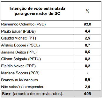 A pesquisa está sob o registro no TRE/SC: Nº SC00031/2014, e no TSE: Nº BR-00901/2014.