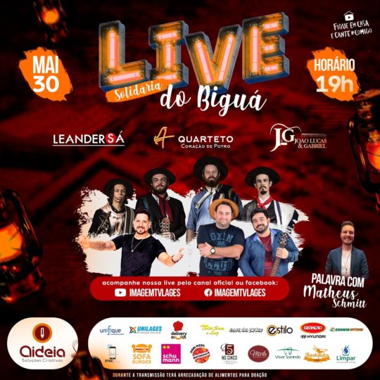 O meu amigo prodígio, conhecido por Biguá, está “aprontando”. Conforme ele mesmo conta, vai apresentar a primeira edição da Live Solidária do Biguá, prevista para o próximo dia 30 de maio, no Clube Caça e Tiro. “Fique em casa e cante com a gente”, diz.