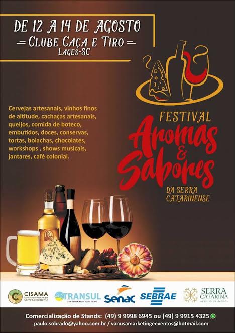 A colega Cris Menegon envia informações sobre o 1º Festival de Aromas e Sabores, as quais, compartilho com vocês. O evento acontece de 12 a 14 de agosto no Clube Caça e Tiro, em Lages.