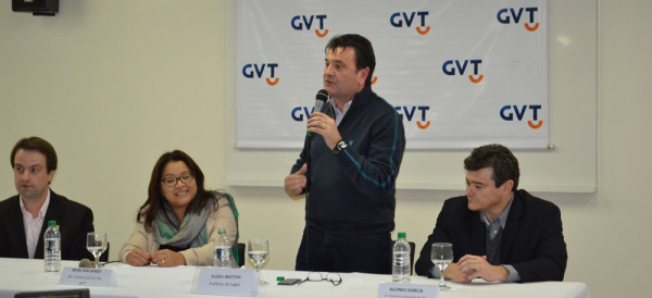 Na tarde desta quinta-feira, dia 29, o prefeito Elizeu Mattos recebeu a visita do diretor de Relações Institucionais da GVT, Alcineu Garcia Villela Júnior, diretamente de São Paulo, e do coordenador de rede, Sérgio Batista.