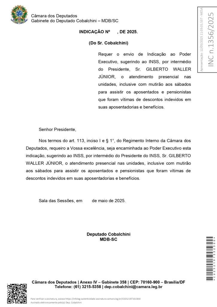 Cobalchini propõe atendimento presencial de segunda a sexta e multirões nos finais de semana, realizados nas unidades do INSS, permitindo que os segurados tenham suporte direto para esclarecer dúvidas e registrar a contestação dos descontos. “O aposentado já teve desconto indevido. Agora, ele, que muitas vezes é um idoso que nem sabe usar aplicativos, terá que descobrir sozinho como contestar. Isso não faz sentido!”, afirmou o deputado.