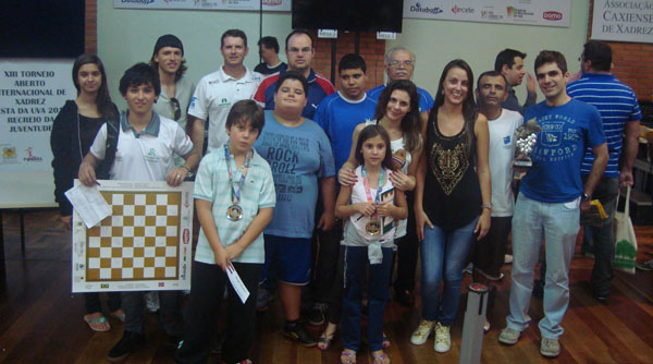 No ano passado, ele esteve em Caxias do Sul (RS). Na foto, Magnus com a enxadrista lageana La Blue e Yan Cordeiro.