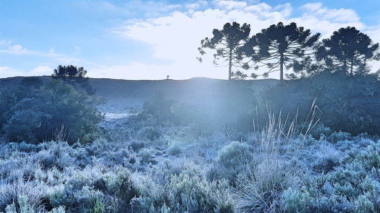 Os campos voltaram a ficar branquinhos de geada e com uma notável camada de gelo recobrindo os automóveis nas ruas e principalmente nas baixadas do município.
